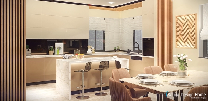 A konyha modernizálásával bekerült egy sziget konyha pult. A konyha szigeten felhasznált exkluzív megjelenésű követ (kvarcit ausztrál dream) visszaköszöntöttük a nappali kandaló falán.