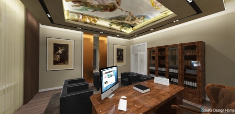 A legnagyobb iroda emeli plusz egy szintre a miliőt. A meghatározó jelegű klasszikus bútorzat mellett finoman köszönnek vissza a modern stílusjegyek, de az elegancia uralkodik a térben.