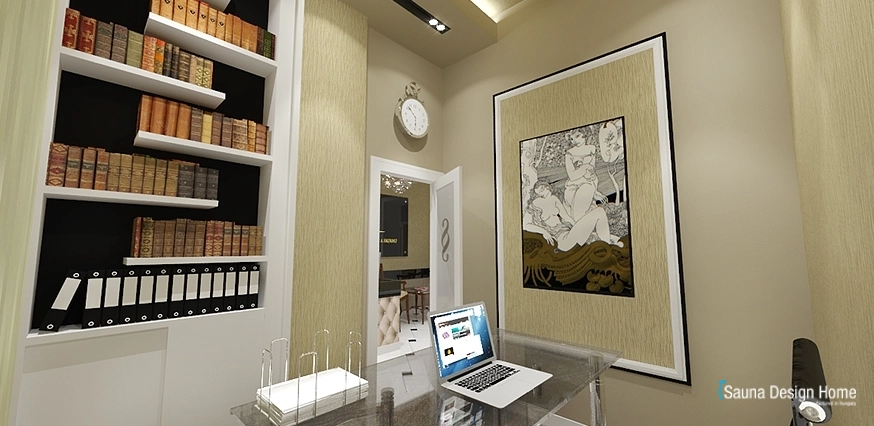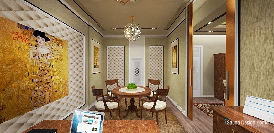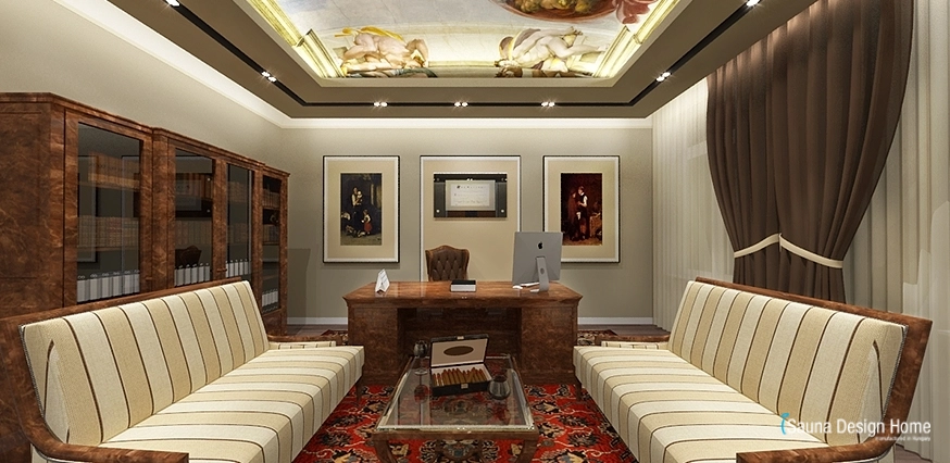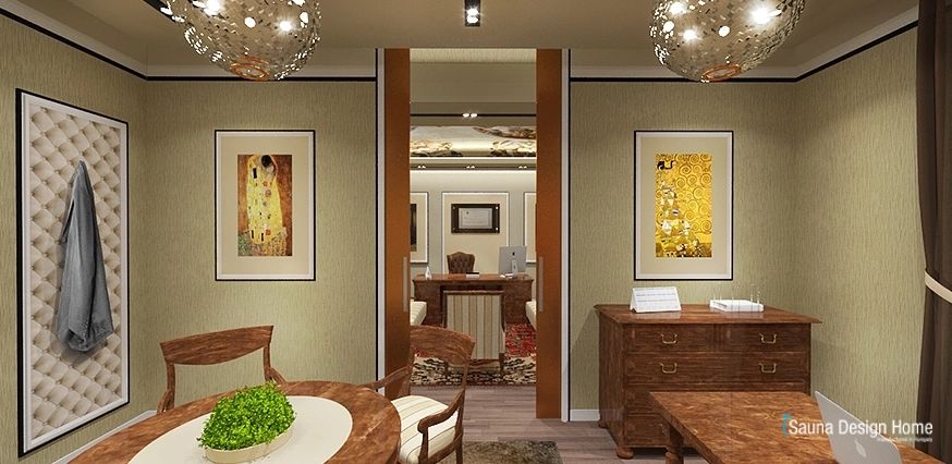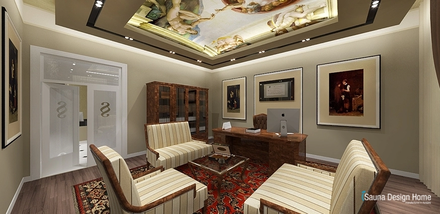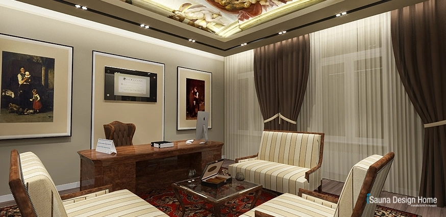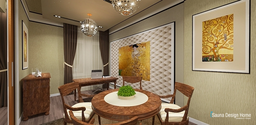A helyiségben egy munkahely és egy körasztalos tárgyaló kapott helyet klasszikus bútorokból kialakítva.