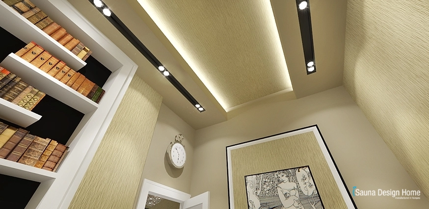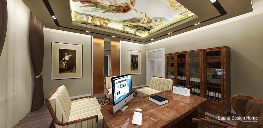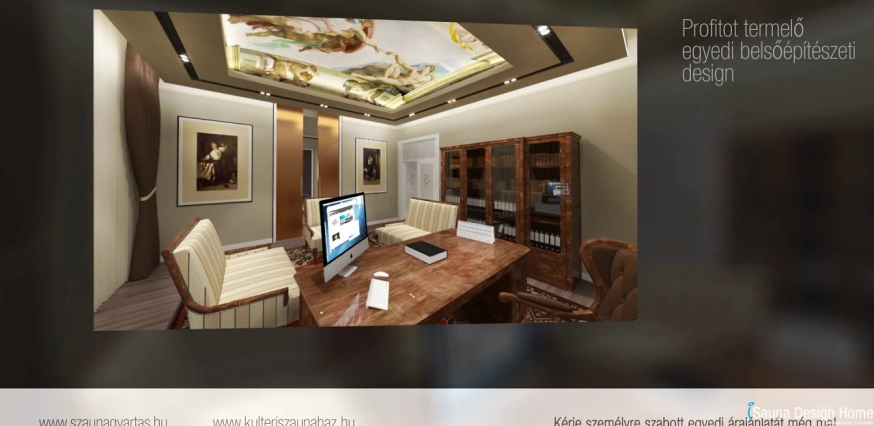 A leghatásosabb eleme a helyiségnek az a speciális álmennyezet, mely finoman ívelt formáján köszönti vissza a Sixtus-kápolna mennyezetfreskójának híres részletét.