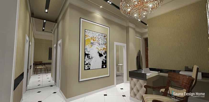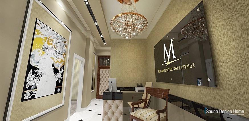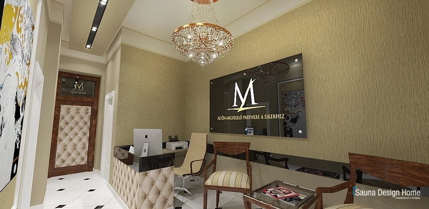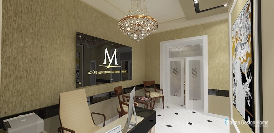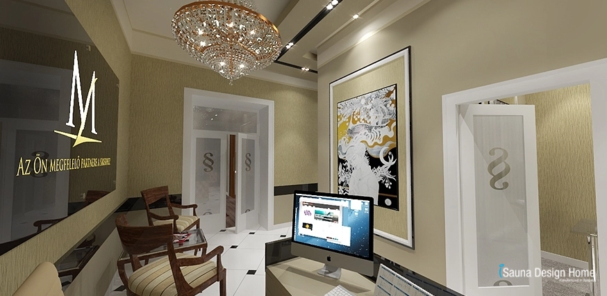 A vállalkozás címere az előtérben kiemelve jelenik meg, ahol egy reprezentatív kristály csillár emeli a helyiség eleganciáját. A titkár pultot helytakarékosan kiépítve egy várakozó is kapott helyet.