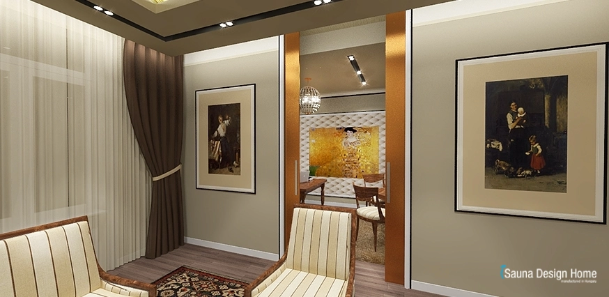 Itt steppelt krém színű falburkolatú betétek, gömb kristály csillárok jelennek meg.