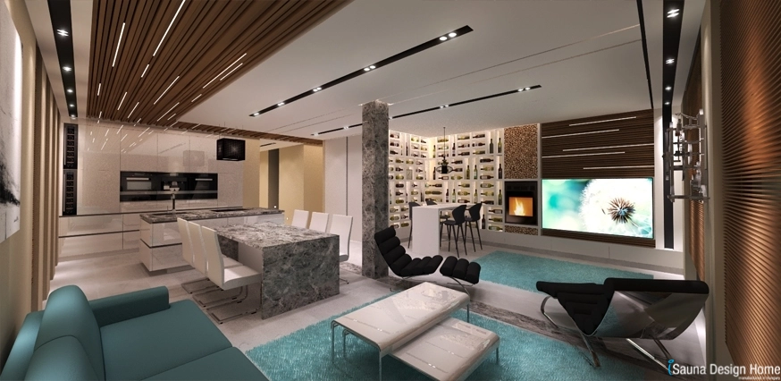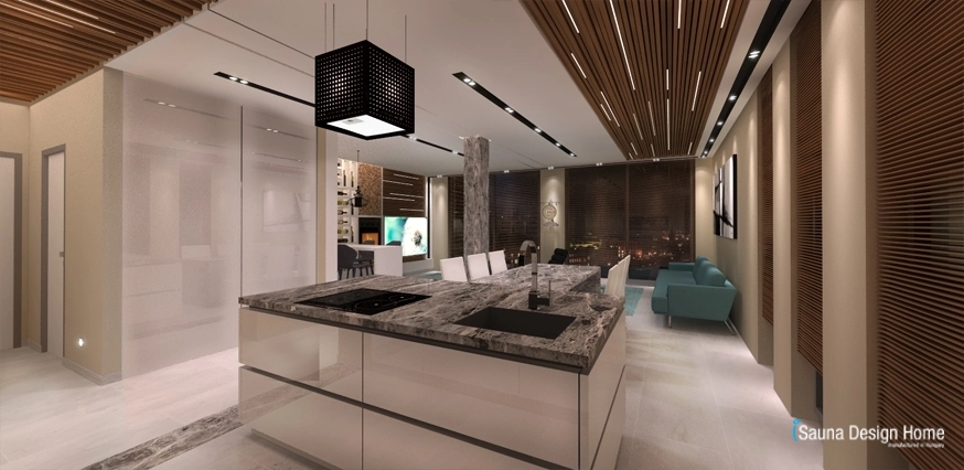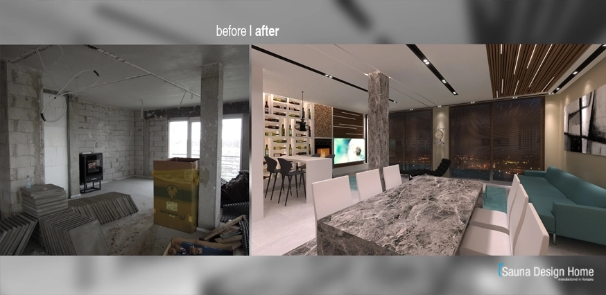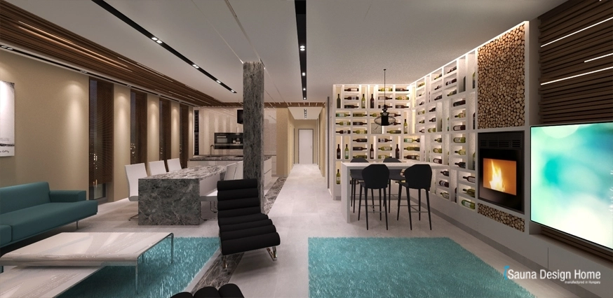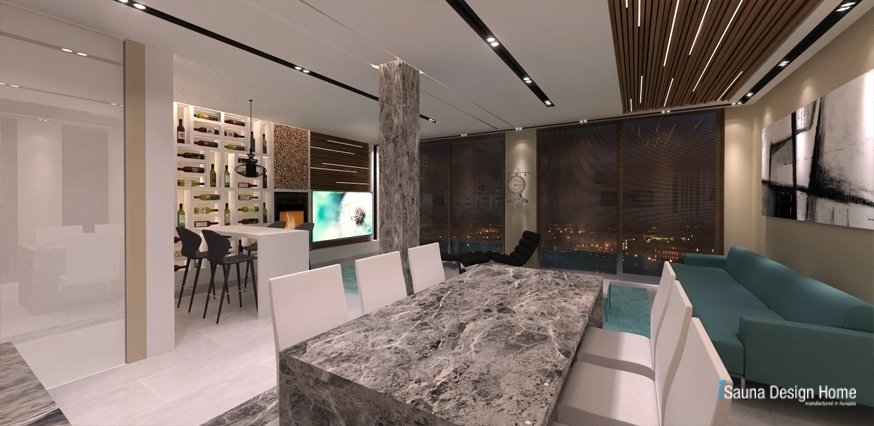 A nappaliba egyedi márványpultot és étkezőasztalt terveztünk, modern minimál konyhát, valamint egy természetességet kölcsönző fatüzelésű kandallót.