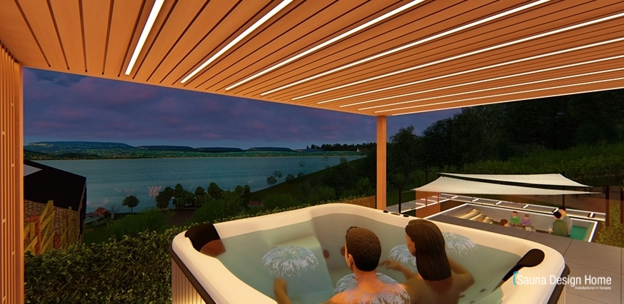 Kültéri szaunaház teraszán a fő szerepet egy Villeroy & Boch Comfort line masszázsmedence kapta. Ha Ön szereti a kényeztetést, akkor imádni fogja a Comfort Line masszázsmedence családunkat.