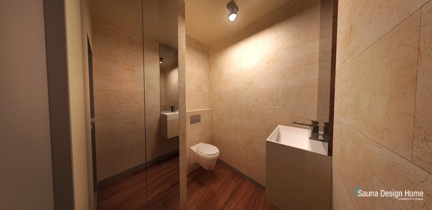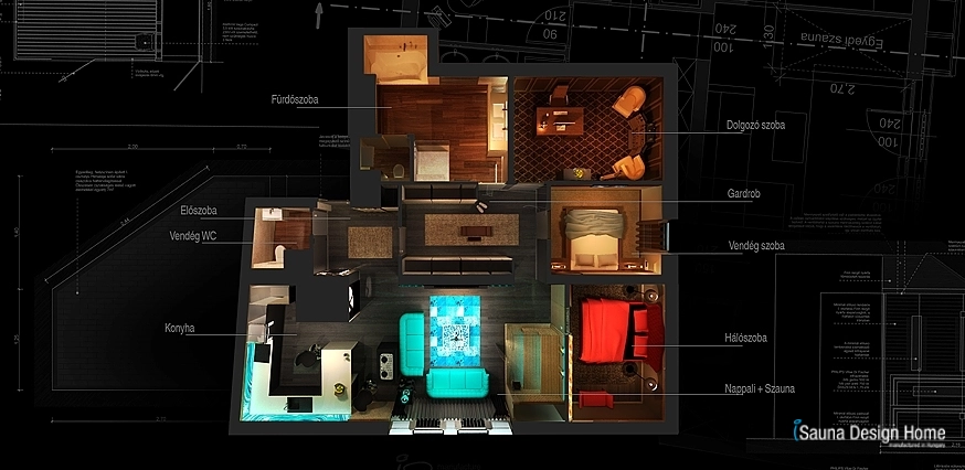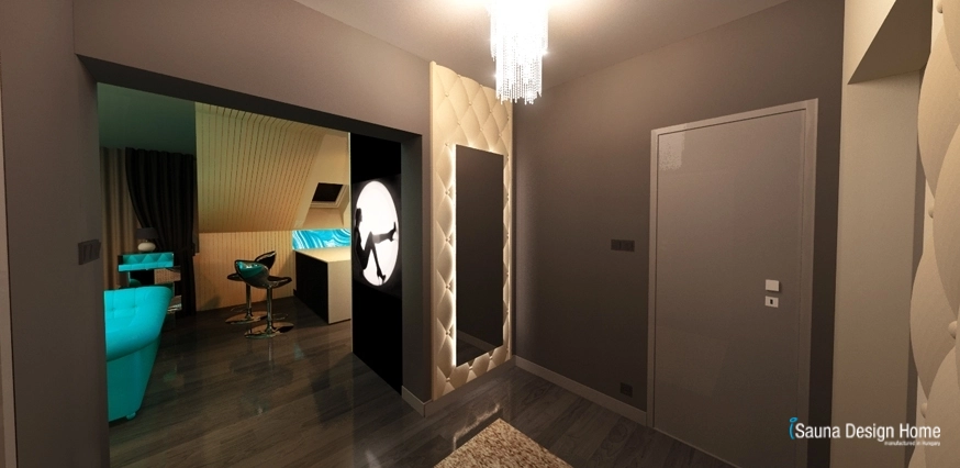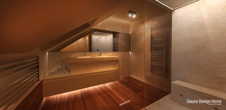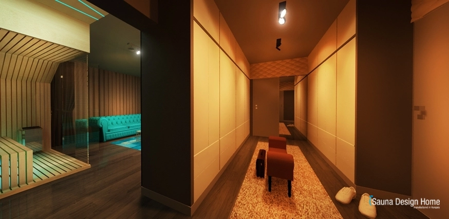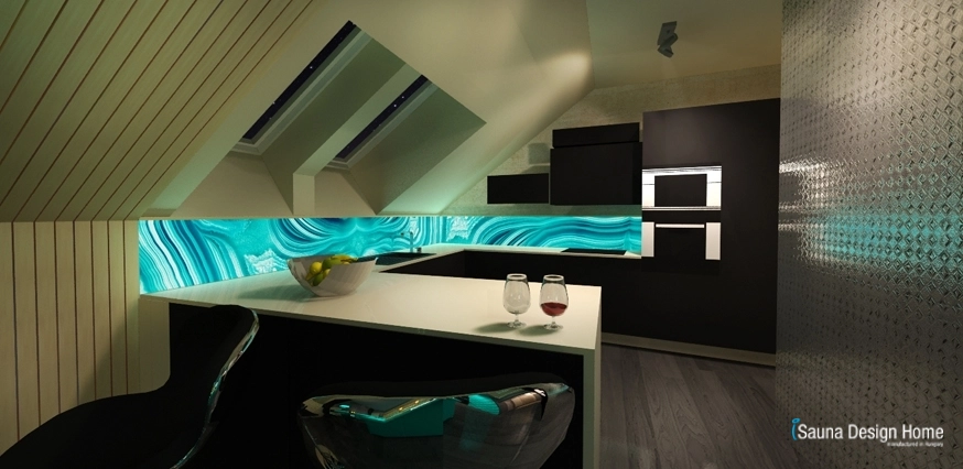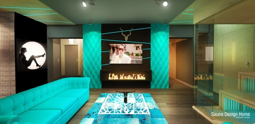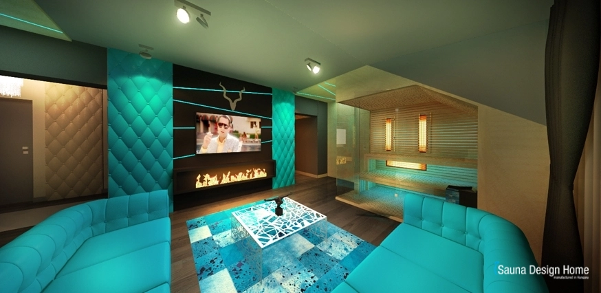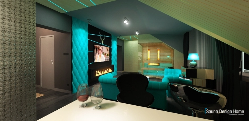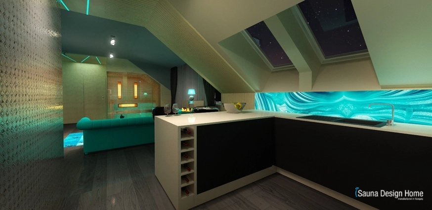 A szauna és a nappali összeolvadását az egyedileg kialakított RGB Led fényterápia adja, mely rendkívüli módon nemcsak a kombinált szaunában, hanem a mennyezetbe is beépítésre került.