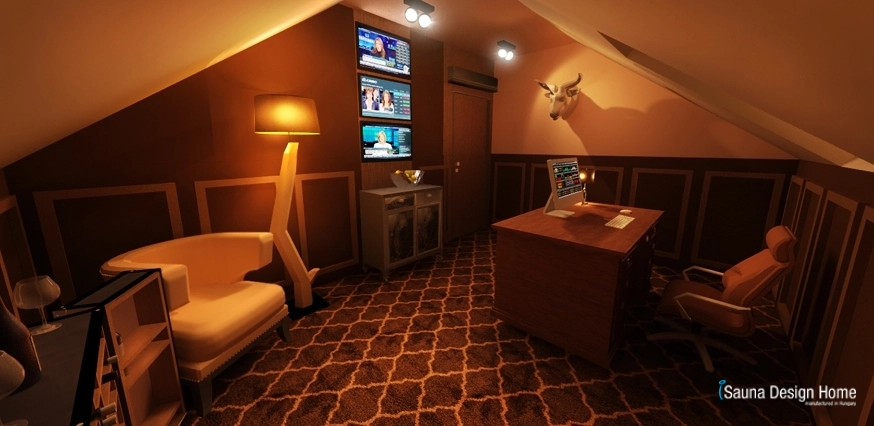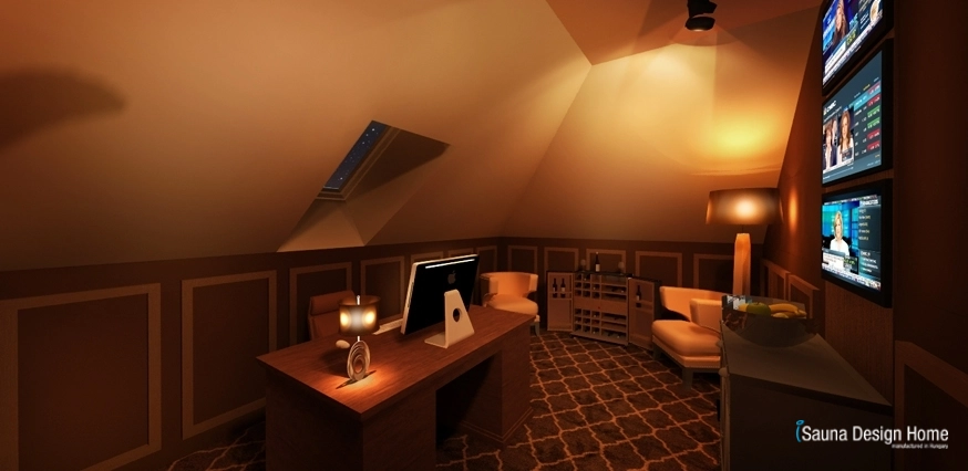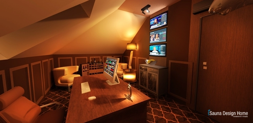 A szoba adottságai pont ideálisak a dolgozó asztal és a monitorok megfelelő elhelyezéséhez. A monitorok mögött szintén visszaköszön a kazettás falburkolat árnyalata. A barnás, természetközeli színek nyugtató hatással bírnak a szervezetre, így tökéletesen alkalmassá teszik a helyiséget nyugodt munkavégzésre.