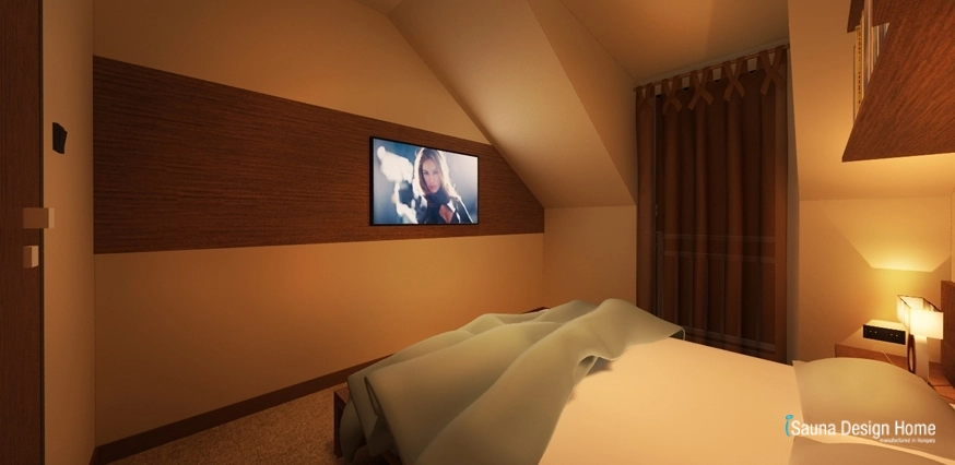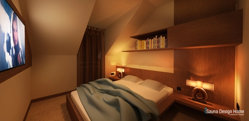 A tetőtéri hálószoba kényelmét az igazi pihenést a különleges KARE franciaágy biztosítja a hozzá illő, válogatott álló lámpákkal. Az iSauna Manufaktúra híres arról, hogy ahol a pihenés és a kényelem megjelenik, ott az egészség is kihagyhatatlan.