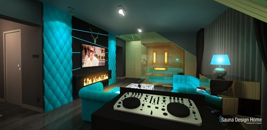 A nappalit határoló pultban egyedileg épített DJ pult került kialakításra, mely a konyhapult szerkezetéből egy mozdulattal kihúzható. A kihúzott DJ pult a nappali felé néz, ahol a közönség akár szaunázhat is.