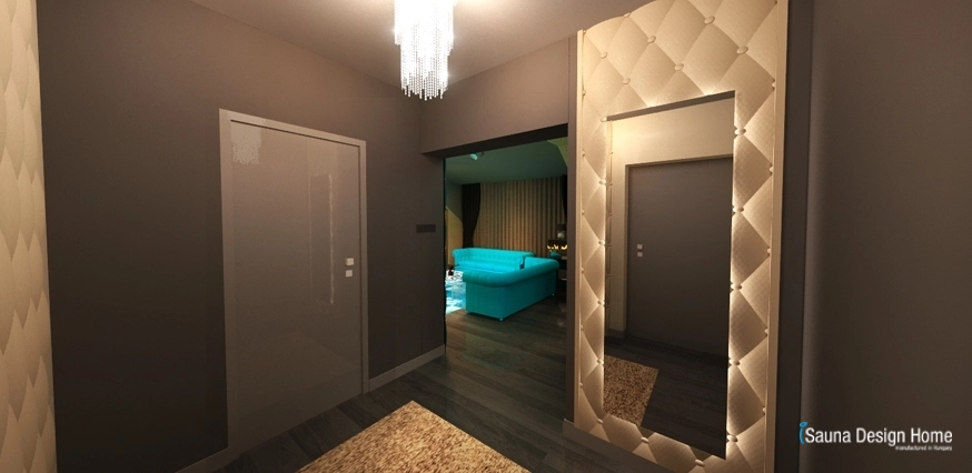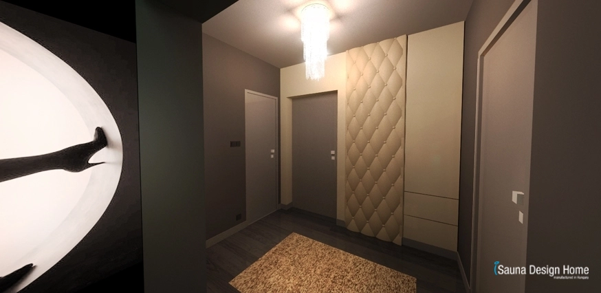 Az egyszerű, de funkciójában és megjelenésében nagyszerű előszoba a gardrób stílusát karöltve került kialakításra. Visszaköszönnek benne a steppelt bőr felületek, melyet a krémszínű beépített szekrények, a különleges KARE kristály csillár és rejtett LED fénysorral megvilágított tükör tesz igazán egyedivé és extravagánssá.