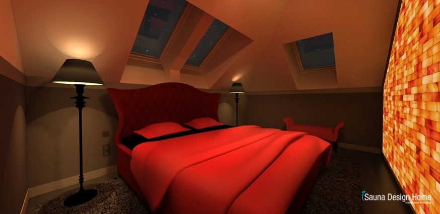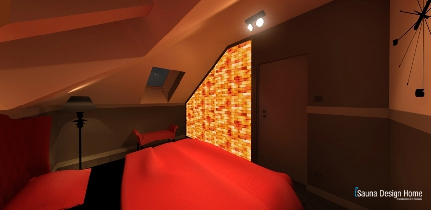 Az ággyal szemközti falra egy egyedileg, kézzel épített nagyméretű, összefüggő Himalája sófal került speciális háttér világítással. A Himalája só biztosítja a sóbarlang szerű mikroklímát a szobában, narancsos színei pedig igazi barátságot kötötnek az ágy és kiegészítők árnyalataival.