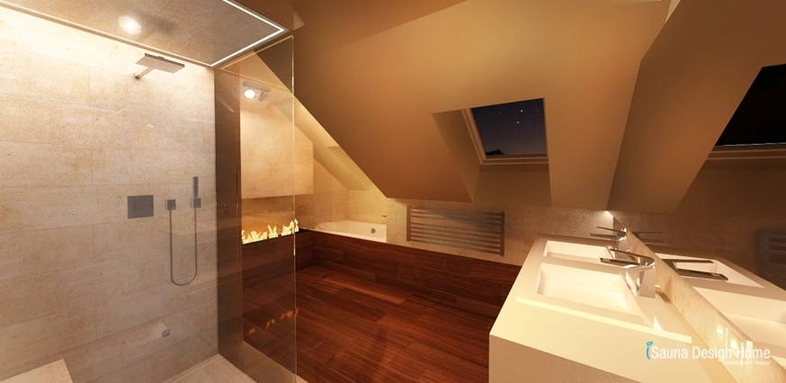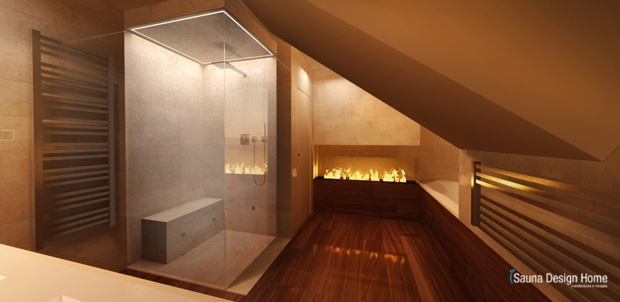 Az egyedileg épített zuhanykabin egyben gőzkabin is, s kényelmét a Süttői leülő kialakítás adja. A fürdőszobában még egy dupla kád található, mely pezsgőfürdő funkcióval kényezteti használóját, miközben a szomszédságában kialakított bioetanol kandalló lángjai teremtik meg a hagulatot. A világos felületeket a falakra részben felfuttatott magasfényű amerikai dió padlóburkolat játékos színei teszik harmonikussá.