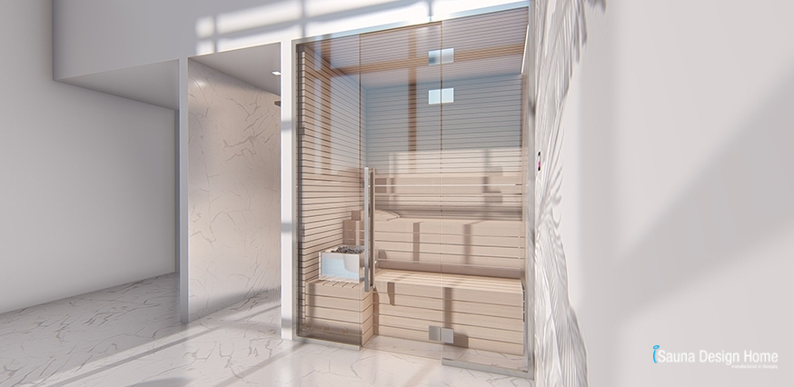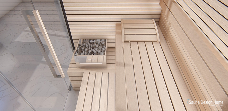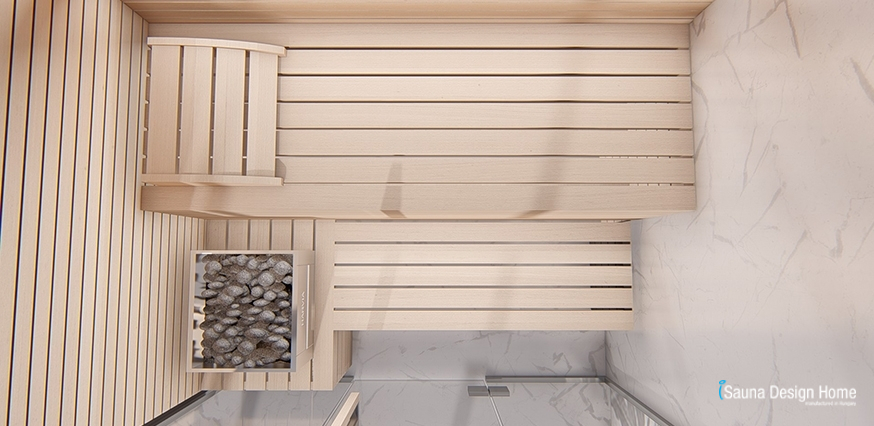 A szauna belső burkolata és kétszintes padozati rendszere A+ kanadai vöröscédrus faanyagból készült, valódi HANDMADE eljárással. Az alumínium profilba rögzített 240 cm magas edzett 8 mm vasoxidszegény üveg front pedig tovább növeli a letisztultság érzését.