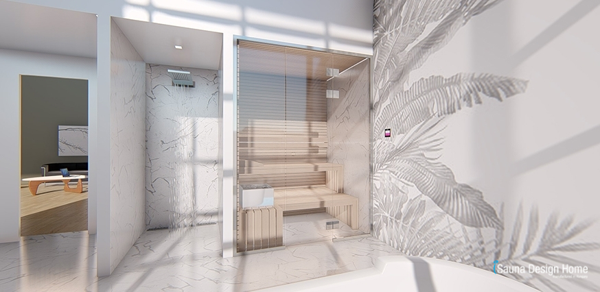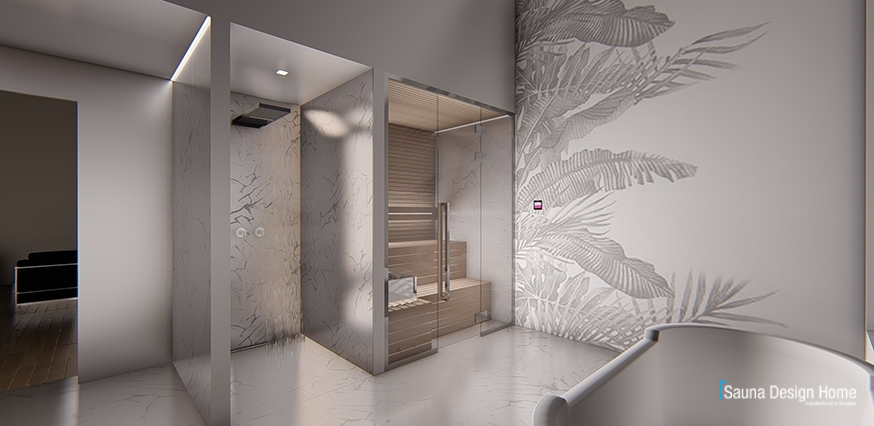 A privát wellnessben kialakításra került egy minimalista stílusban készült egyedi finn szauna, rejtett LED világításokkal, Harvia Virta Pro 9 kW króm anyagú szaunakályhával.