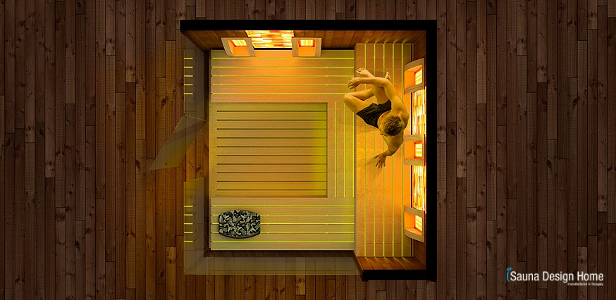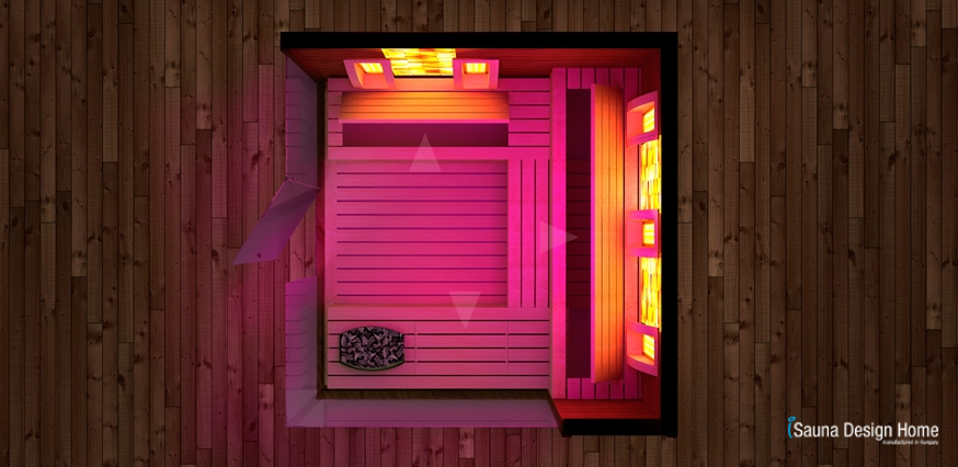 Collaxx fényterápia található az egyedi, kombi szauna mennyezetében. A szauna távirányító segítségével különböző intenzitású és színű fényeket állíthatunk be egyedi hangulatunktól függően.