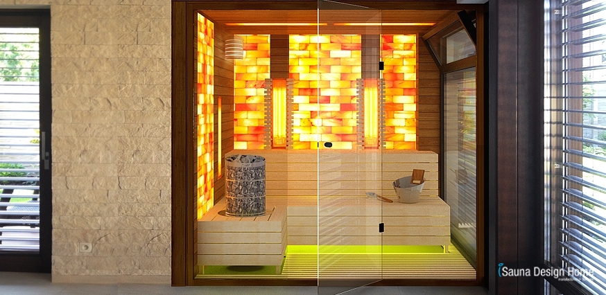 A kombinált szauna különleges belvilágát a sóterápián kívül a minőségi faanyagok és a nagy üvegfelületek nyújtják.