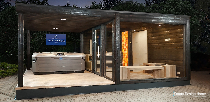 Az előtető alatt a moduláris JetPack technológiával ellátott Villeroy & Boch premium line jacuzzi garantálja a gyógymasszázs élményét. A teraszrendszer extravagáns megjelenését és hosszú távú stabilitását egy 4,4cm vtg. I.osztályú Thermowood Éger fa biztosítja.