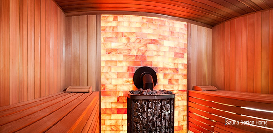 A nagy teljesítményű, fatüzelésű, szauna kályha nem érintkezhet fával, ezért tökéletes megoldás volt a fatüzelésű szauna kályha mögé épített himalája sófal.