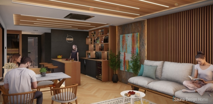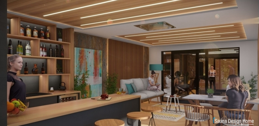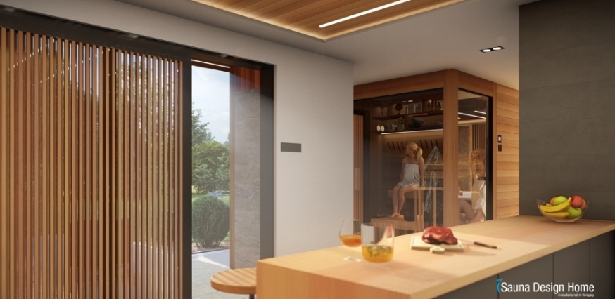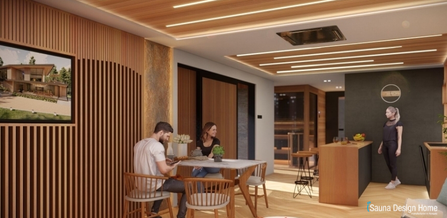 Megbízónk kifejezett kérése volt, hogy lehetősége legyen arra, hogy a hétköznapok fáradalmait elengedhesse az otthona kényelmében, akár a szerettei körében is. Az elképzelésének eleget téve, terveztünk az épületbe egy funkcionális edzőtermet, továbbá egy közösségi teret, ahol egyedi kézzel készített konyhabútort, magas minőségű gépekkel felszerelve, finn szaunát zuhanyzóval, relaxációs, pihenő helyiséget, ahová elhelyeztünk egy felsőkategóriás Villeroy & Boch jakuzzit.
