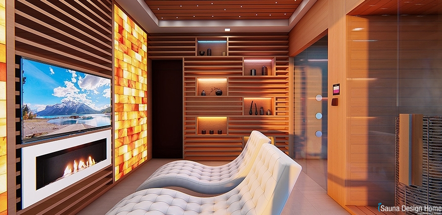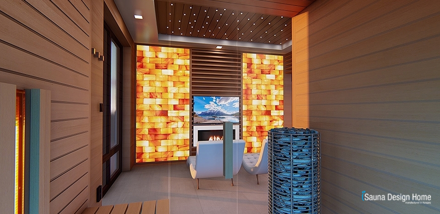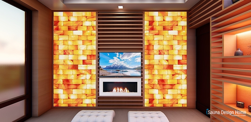 A pihenőtérben kialakításra került még egy nagy felületű Himalája sófal látványkandallóval és smart tévével.