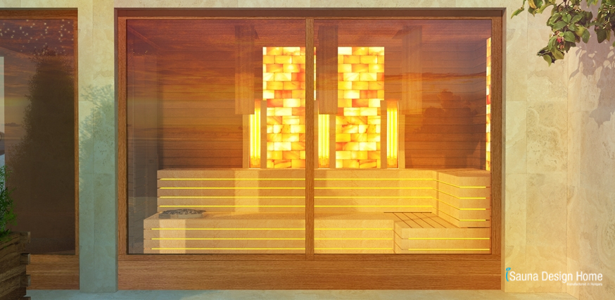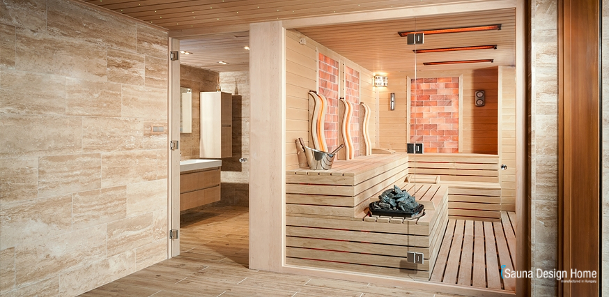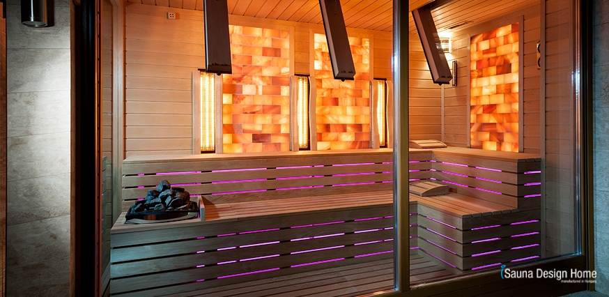 A kombinált szauna finn szauna kályhája a padozatba süllyesztve illeszkedik a letisztult formavilághoz. Az infraszauna hatását a lehajtható infraszauna panelek emelik. A himalája sóterápia egészségre gyakorolt hatása mind a finn szauna, mind az infraszauna használatakor élvezhető.