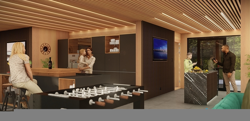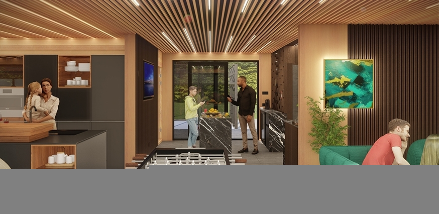 Tovább haladva a közösségi pihenőtér felé egyedi média falakat találunk, melyekkel tovább erősítjük a tömörfa burkolatok kapcsolatát a természet közelségével. Az egyedi kanadai vöröscédrusból készült média falak TV, hangprojektor és más, egyéb szórakoztató elektronikai berendezések beépítésére alkalmasak beltéren és kültéren egyaránt.