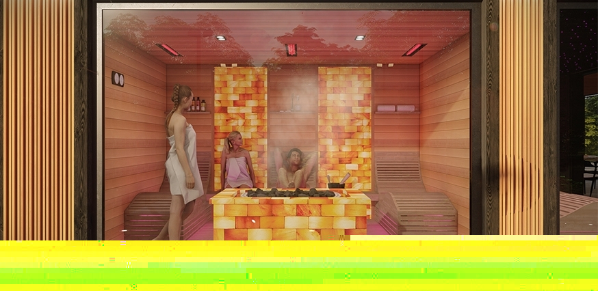 A kombinált szauna térben a tágabb család és a baráti társaság is élvezheti a forró finn szauna előnyeit, és az infraszauna méregtelenítő hatását. A kombinált szaunában is teret kapott a szaunakályha köré épített egyedi Himalája sófal, mely a meleg hatására még intenzívebben fejti ki jótékony hatását a légutakra és bőrre egyaránt.