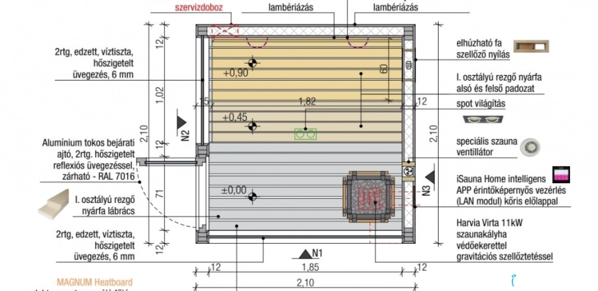 • Edzett, hőszigetelt (4+4) víztiszta üvegezés a szauna frontján és jobb oldalán