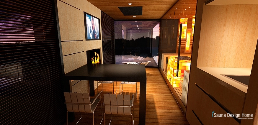 Az egyedi, luxus szaunaház ezen kívül zuhanyzóval, öltözővel, pihenővel, konyhával, étkezővel, tv-vel és elhúzható üvegajtókkal felszerelt.