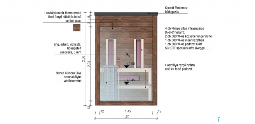 • Edzett, hőszigetelt (4+4) víztiszta üvegezés a szauna frontján és jobb oldalán