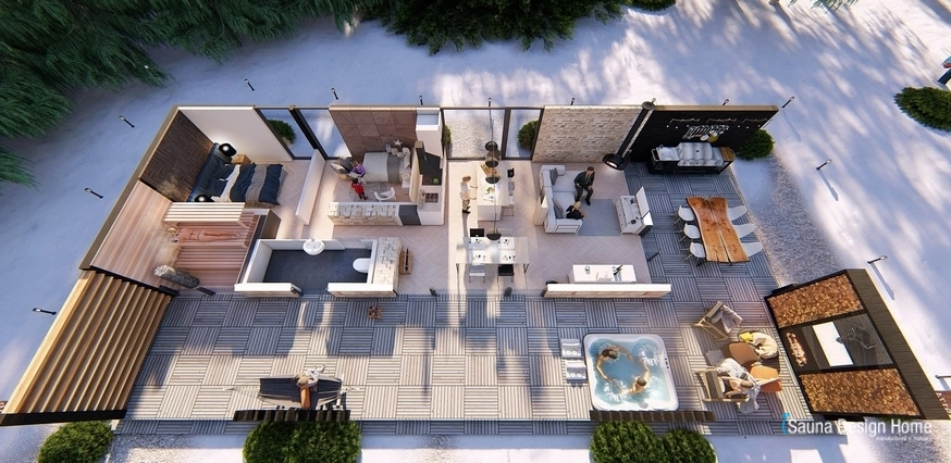 Villeroy & Boch prémium masszázsmedence, egyedi építésű finn szauna, látványkandalló, tv, grill sarok és egy rusztikus-modern fa étkezőasztal.