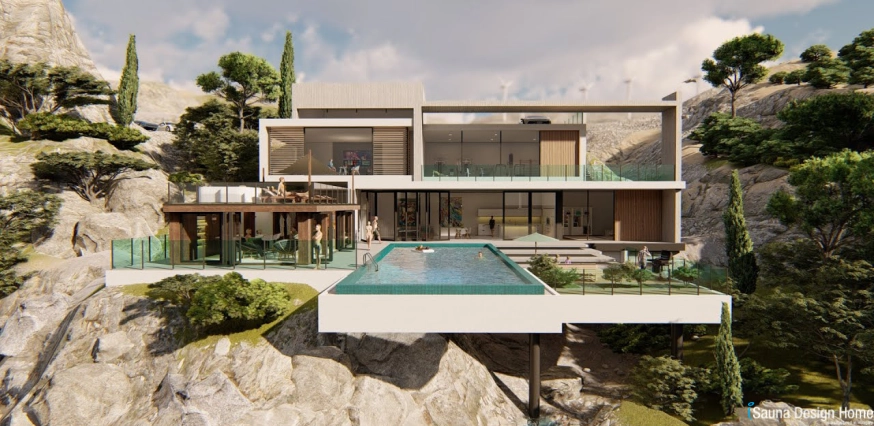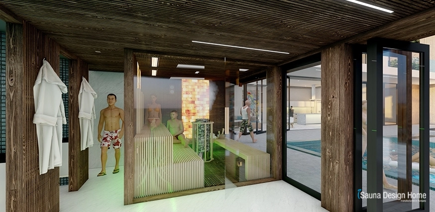 Az exkluzív szaunaházban kialakításra került egy tágas családi kombinált szauna himalája sófallal, I. osztályú thermowood tiroli fenyőből minimál stílusban, toalett, élmény zuhany  illetve egy extravagáns pihenőtér louge bárral, mely hűsítő koktélokkal várja az arra vágyókat. A pihenőtérben az egyedi kivitelezésű falburkolatok LED világításokkal igazi bravúros mérnöki megoldásokkal teszik hangulatossá, meghitté a szaunaház belső terét. A pihenőtér speciális egyedi  tolóajtó rendszerrel van felszerelve, ami biztosítja  a közvetlen kapcsolatot a kültéri medence és a pihenő tér között. A nyári melegben így egy kellemes nyitott terasszá alakul át a zárható pihenőtér.