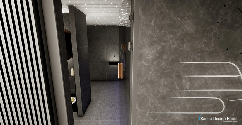A jégbarlang hatást keltve a vizesblokk területén a falak sötétszürkék, a mennyezet fehér kiegészítve csillagos égbolttal.