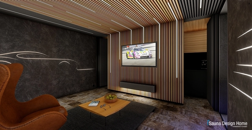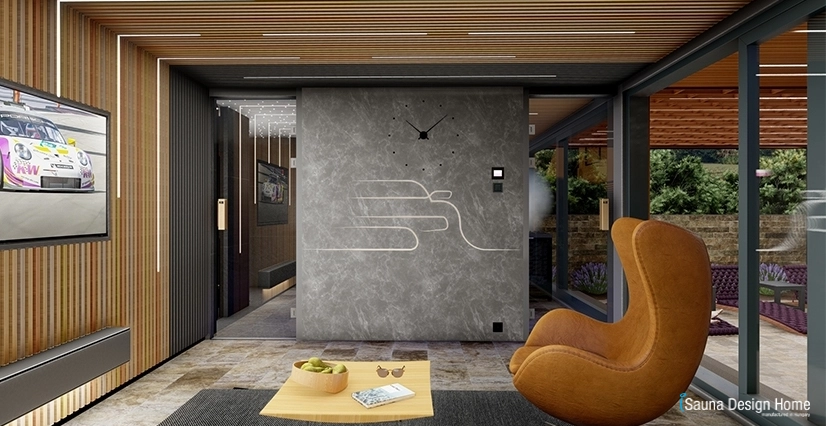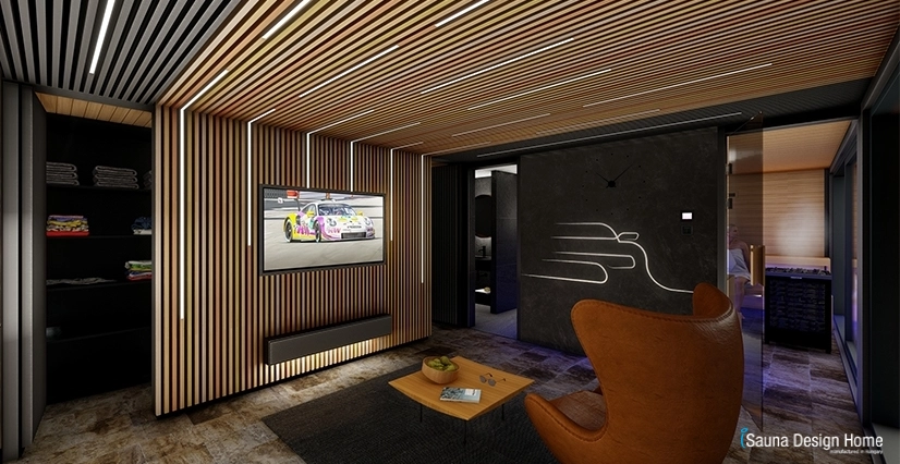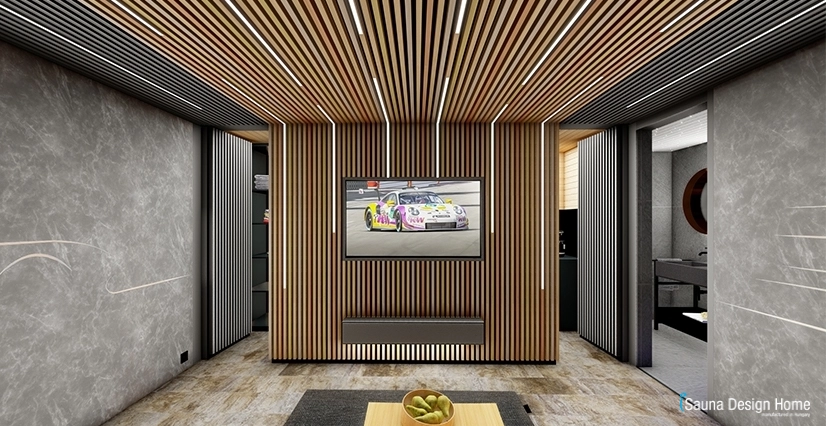 Ugyanilyen designfalat építettünk a pihenő hátfalára, benne hosszában süllyesztett LED szalagokkal szabálytalanul, ez a vonalvezetés és a designfal is folytatódik a szaunaház mennyezetén.
